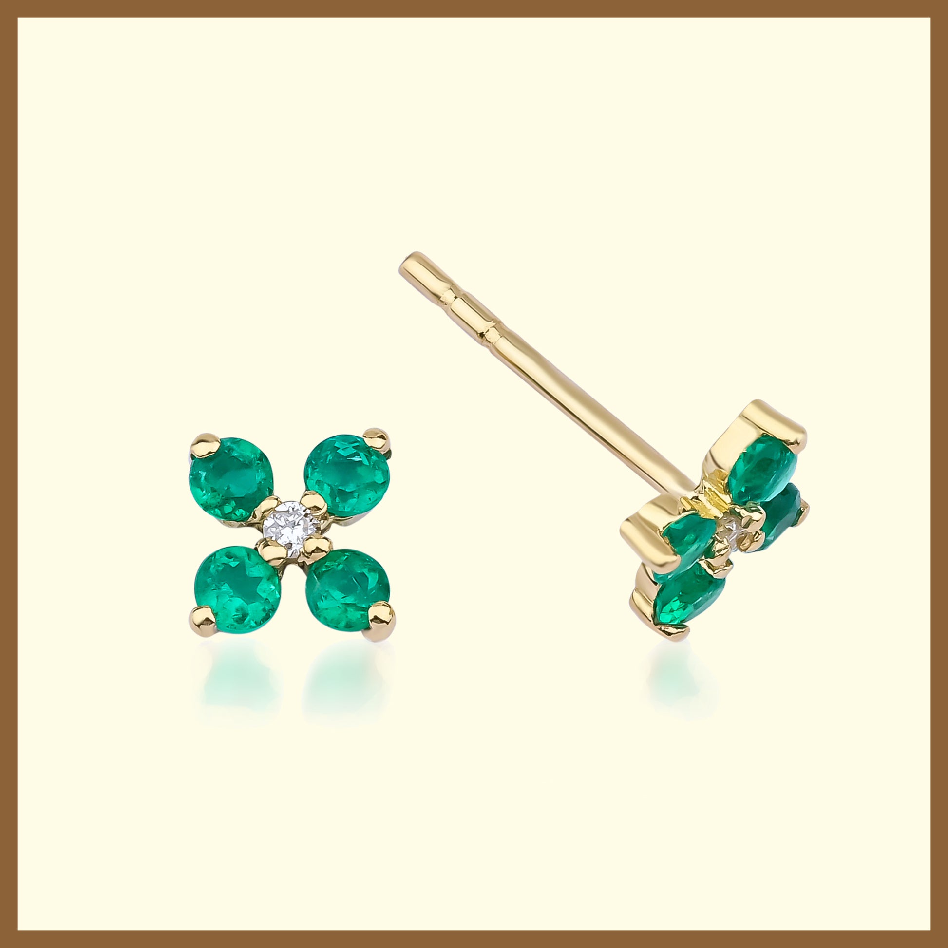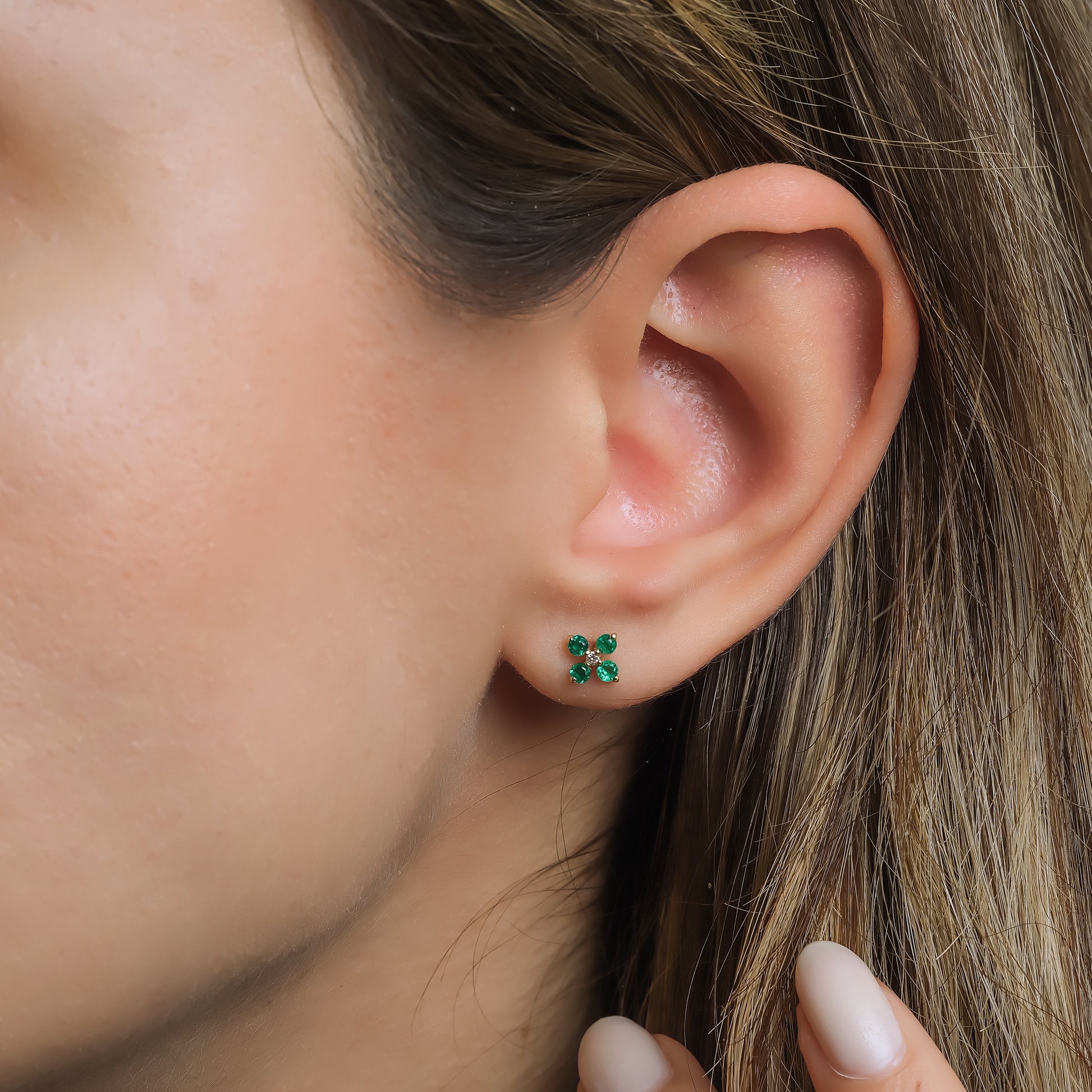 Minimal Yonca Zümrütlü Pırlantalı 14 Ayar Sarı Altın Küpe